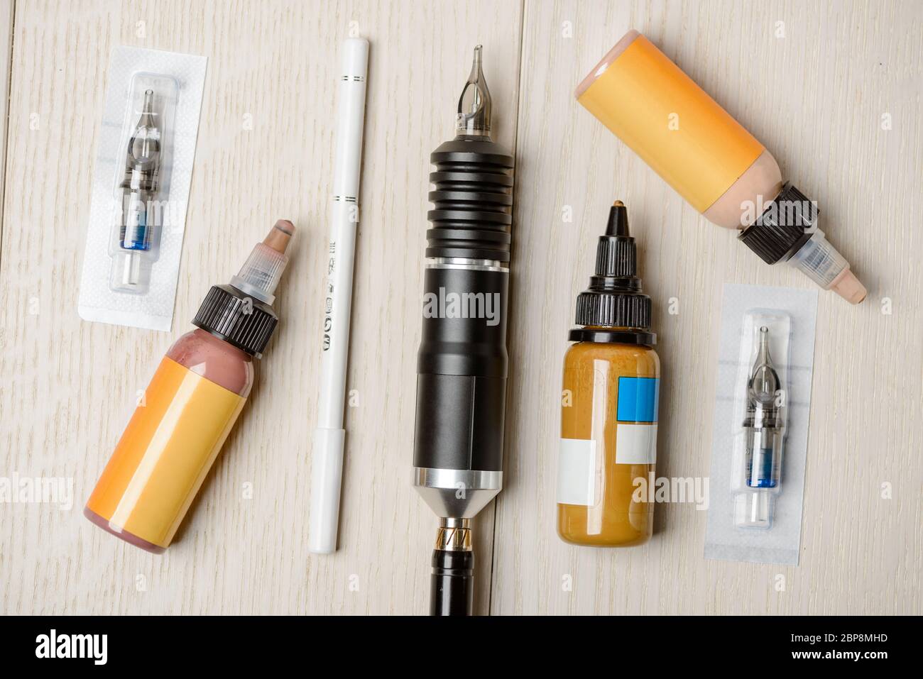 Compact Tattoo Machine Inks And Needles On Wooden Table Stock Photo Alamy